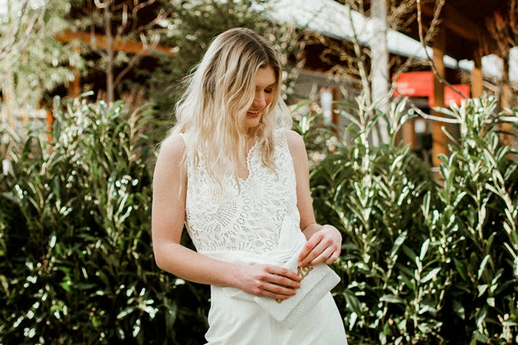 The Emery Jumpsuit is one of our classic bridal pieces. A clean, crisp ankle length jumpsuit featuring a sleeveless lace v-neck top and plenty of stretch. Flattering and comfortable on all figures. Hidden back zipper enclosure. Crepe straight legged pants. Fully lined.