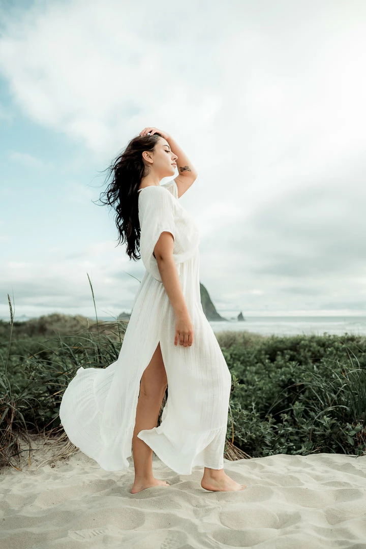 Effortless and timeless, the Nomad maxi features a slightly a-line skirt and dramatic, floaty sleeves. Silver metallic threading throughout the fabric makes this piece feel that much more special. Can also be worn as a cover-up as well as a honeymoon night out dress. Slightly sheer. Side slits. Available in black and white.