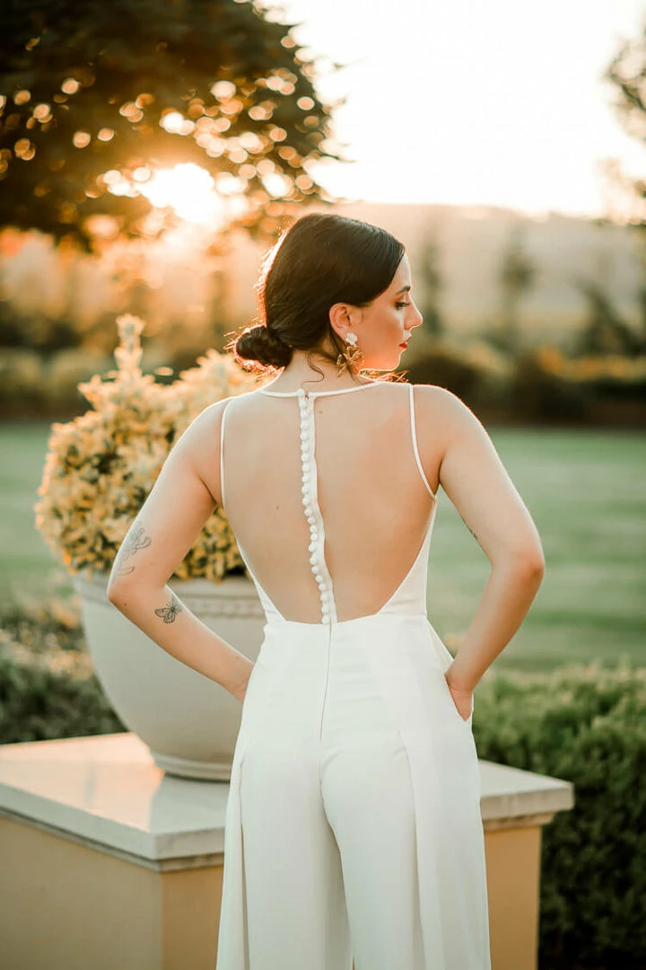 A sheer back and wide leg crepe pant bring ample drama to this bridal jumpsuit. The Elyse Sheer Back Jumpsuit from Amsale Bridal’s “Little White Dress” collection is a perfect choice for a bride wondering what to wear to a rehearsal dinner or as an alternative to a traditional wedding dress. The sheer back is finished by a delicate row of buttons down the back, concealing a hidden zipper. Side pockets. Â