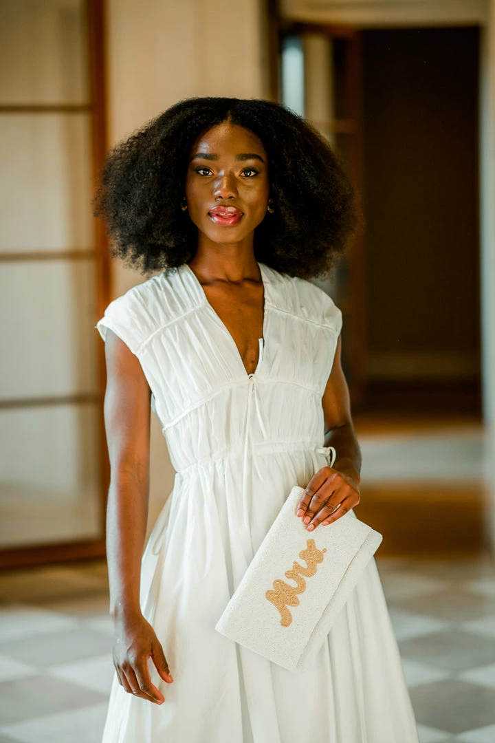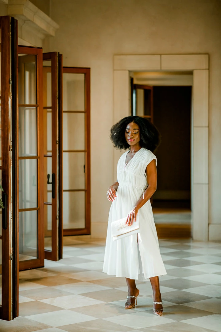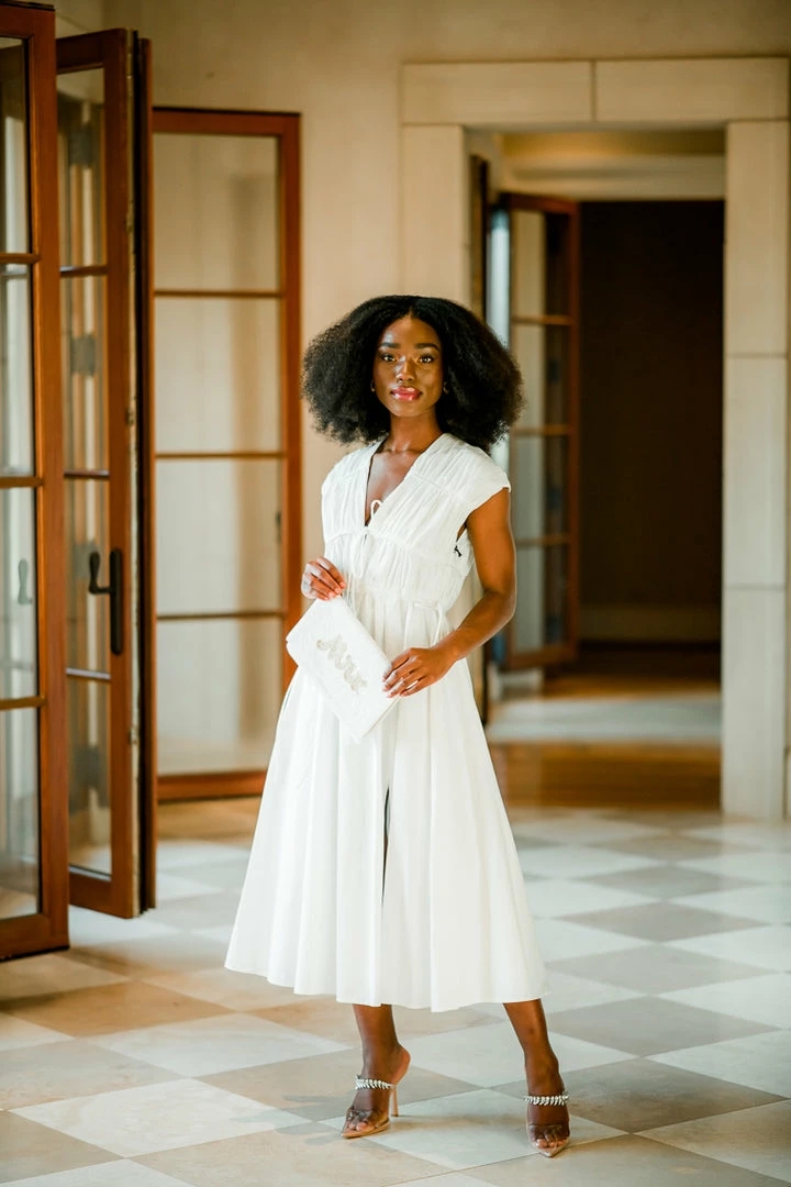 Our favorite pick for bridal events for our modern brides. Cut from 100% cotton, the Lorrie midi dress features gathered detailing on the bodice and a plunging neckline. Delicate ties adorn the top while the bottom flares out into a flattering circle skirt. Front slit accent. V-cut back.   We’re wearing with our Mrs bag to our rehearsal dinner.