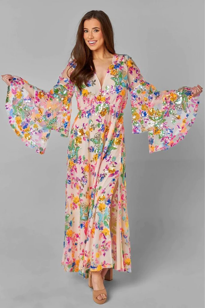 This sequin stunner from Buddy Love is a viral sensation! The Colette dress broke the internet with its TikTok popularity, and with its bright, bold sequin floral pattern, it’s easy to see why. This silhouette features a deep v neck, bell sleeves, fully lined and an empire waist for a flattering fit. The Colette is the most perfect dress for any celebration!