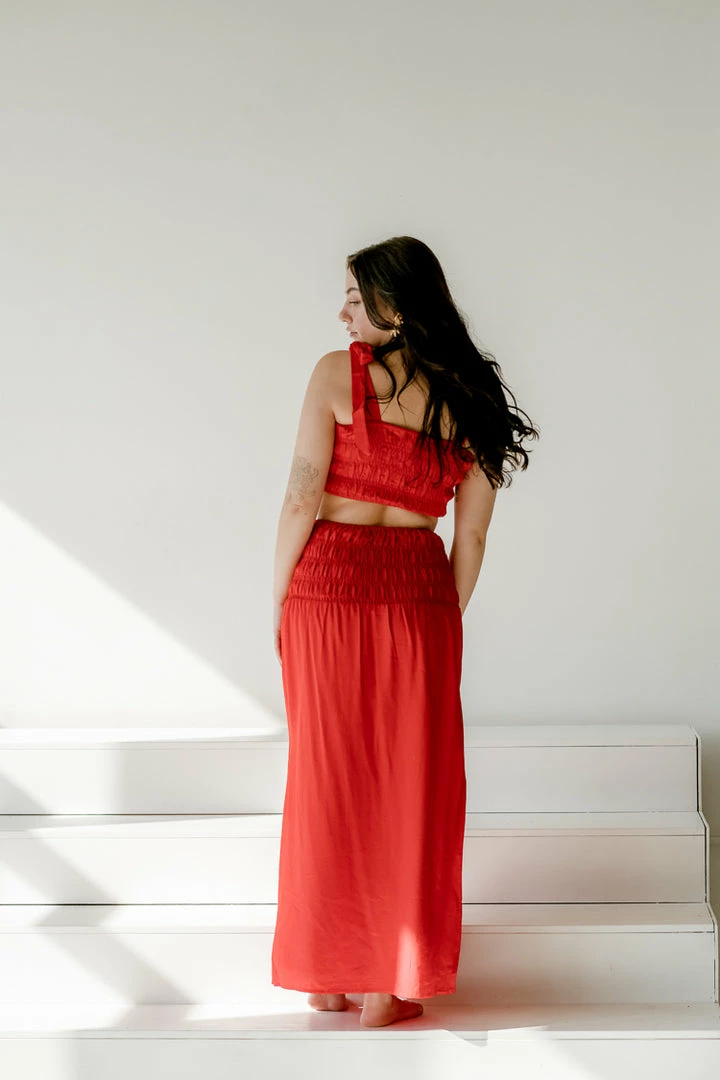 A fiery red orange hue gives the Marsha Maxi Skirt show-stopping firepower. Pair with the matching Marsha crop top for your next vacation. This maxi skirt features a smocked waist and mid-thigh slit.