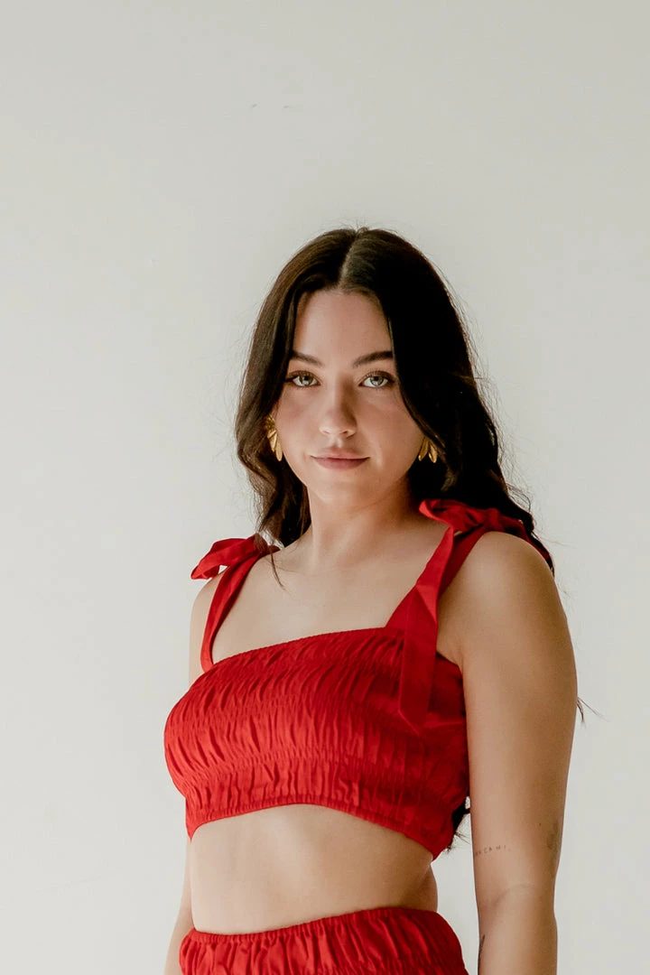 A fiery red orange hue gives the Marsha Top show-stopping firepower. Pair with the matching Marsha maxi skirt for your next vacation. This crop top features a shirred bust, square neckline and shoulder ties.