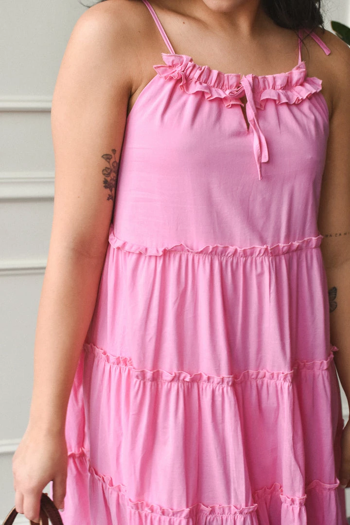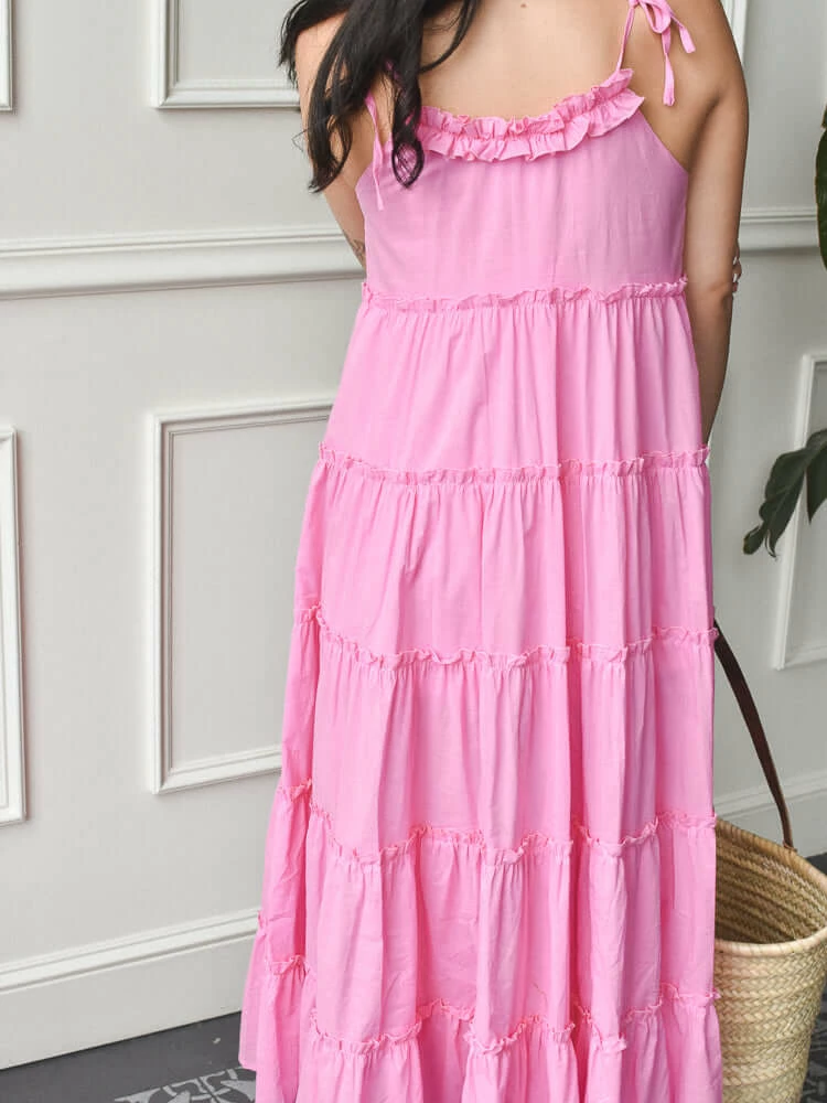 Bubblegum pink is one of THE colors for 2021, so perk up your warm weather wardrobe with our Senorita Pink Maxi Dress from Australian brand Charlie Holiday. This sweeping tiered maxi dress is cut from airy cotton. Key hole detail at neckline and adjustable straps. 100% cotton.