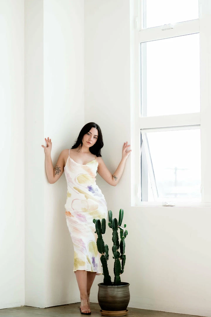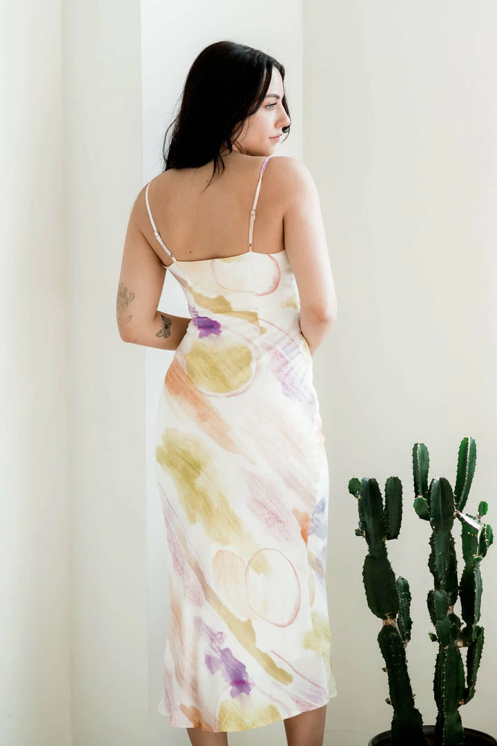 A slinky, sexy midi dress to wear all spring and summer long. The Zia Dress from Charlie Holiday is a slim fit midi features a cowl neckline and adjustable shoulder straps in a soft watercolor print fabric.