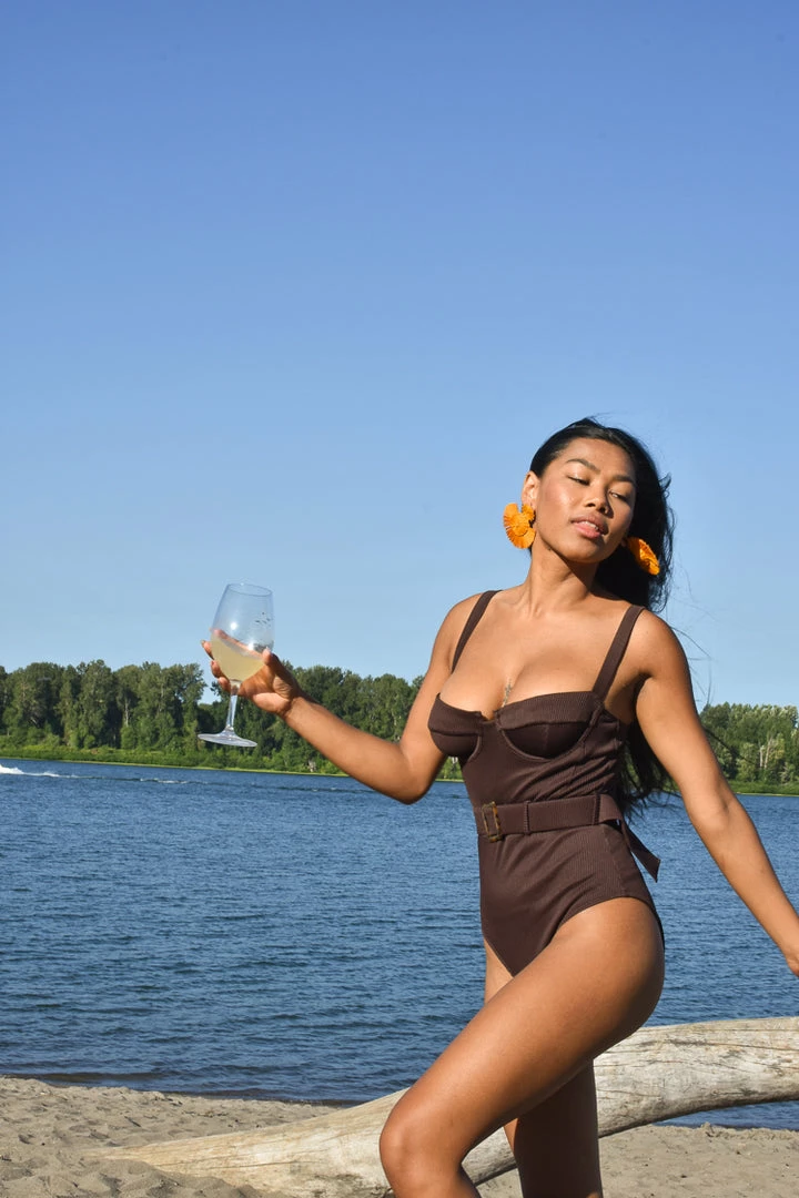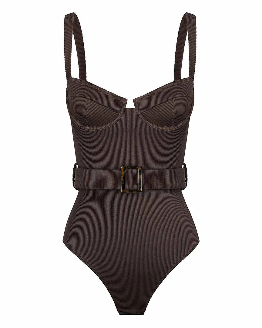 A flattering swimsuit with major retro vibes, meet Zola from Australian brand Charlie Holiday. Cut from sleek deep brown ribbed fabric. Accented with a belt. Balconette-style bra top. Also doubles as a vacation bodysuit.