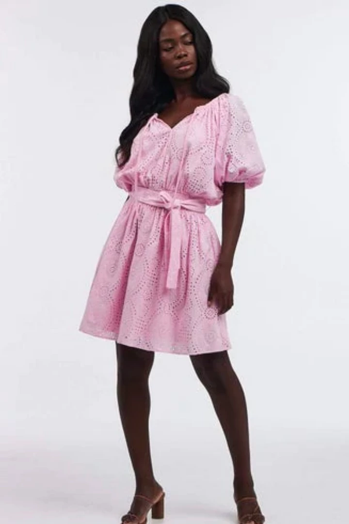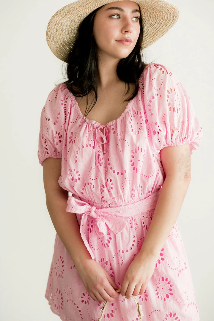 The Tayla Pink Eyelet Dress from Charlie Holiday makes it feel like spring all year long. Featuring short sleeves, a smocked waist and optional matching belt. Hits mid-thigh. Pair with sneakers for an easy everyday look or add a straw hat for your next warm weather weekend. 100% cotton.