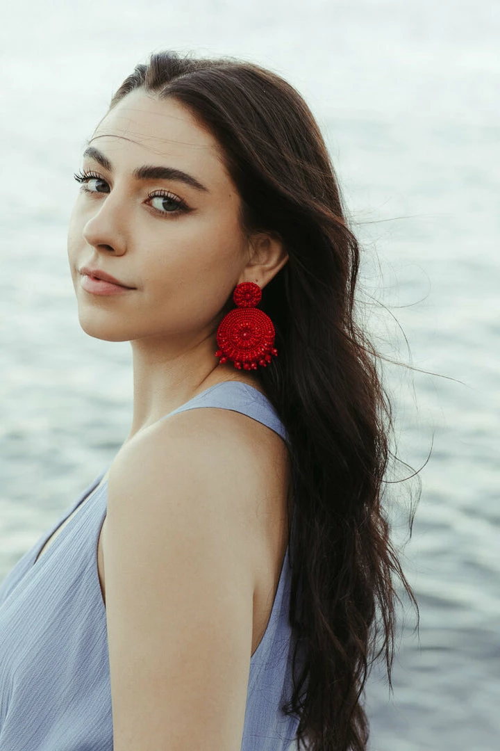 Looking for a statement earring to celebrate the summer season? Try our Jayna Beaded Circle Earrings. This drops features seed beading in a decorative geometric design. Available in red and blue. Post closure.