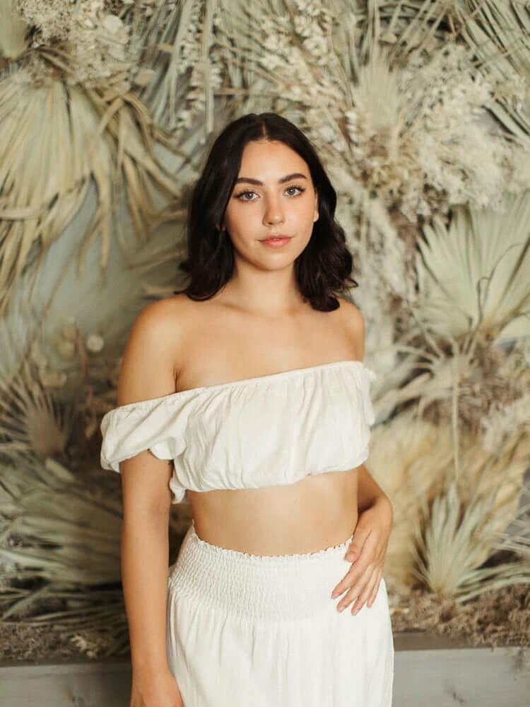 Ready for vacation! The Bacalar is a two-piece cream linen-mix set with a relaxed, puff sleeve crop top and tiered maxi skirt. The skirt features a smocked waistline for a bit of stretch. The crop top also has elasticized arm and waist bands.