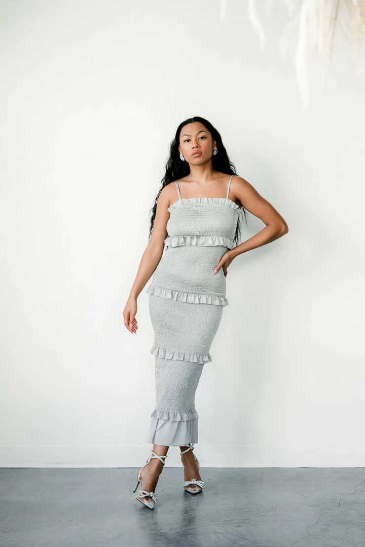 Tiered ruffles and soft ruching make the Bowery Dress both sexy and stylish. Cut from a silky sage fabric, this style hits mid-calf. Pair with heels and glittering earrings for your next date night out.