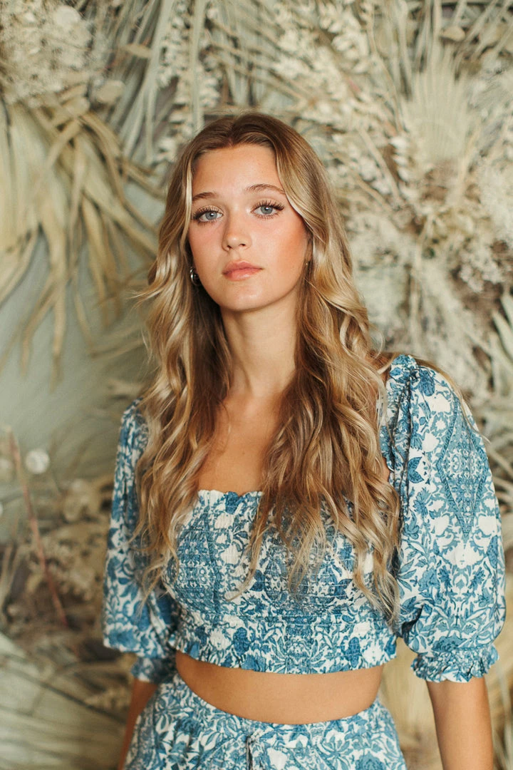 One of our favorite new vacation two piece sets, meet Carmina. This set features a soft blouson crop top and tiered maxi skirt (sold separately). Cut from a blue boho print fabric, the Carmina crop top has a smocked bodice and puff 3/4 sleeves for easy wearing. Pair with the Carmina Maxi Skirt for a total vacation date night look.