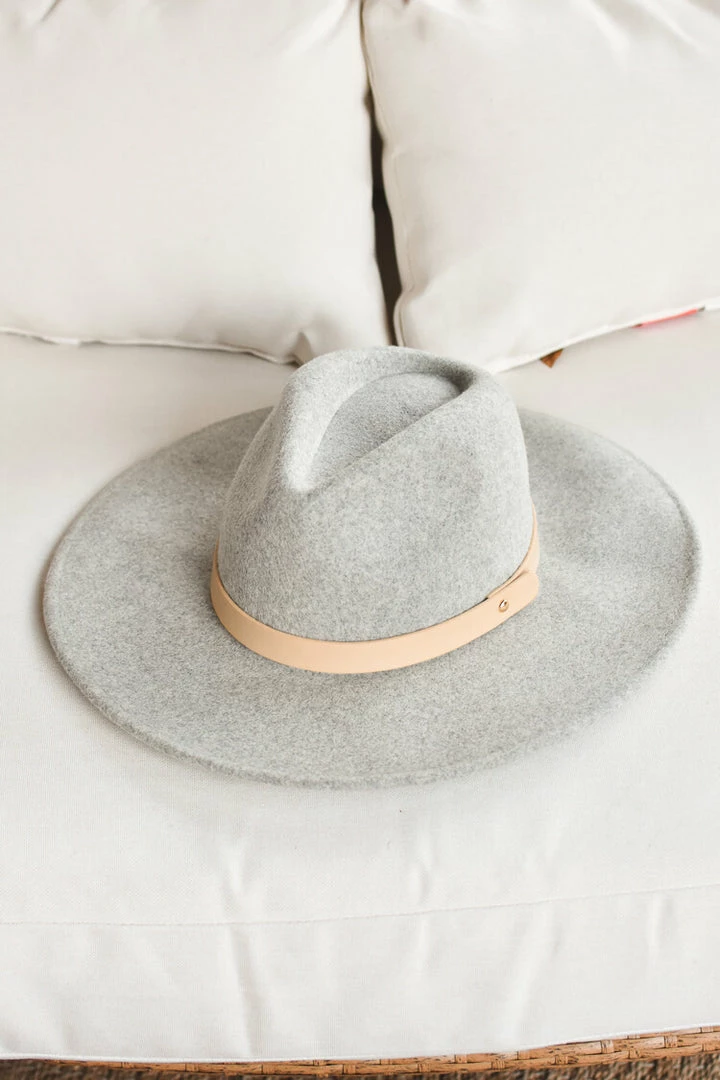 Camel-colored trim brings an understated yet elevated feel to this classic heather gray fedora hat. Adjustable sizing inside gives you the perfect, personalized fit. Pair with our English Rose blue floral dress for an updated spring look.