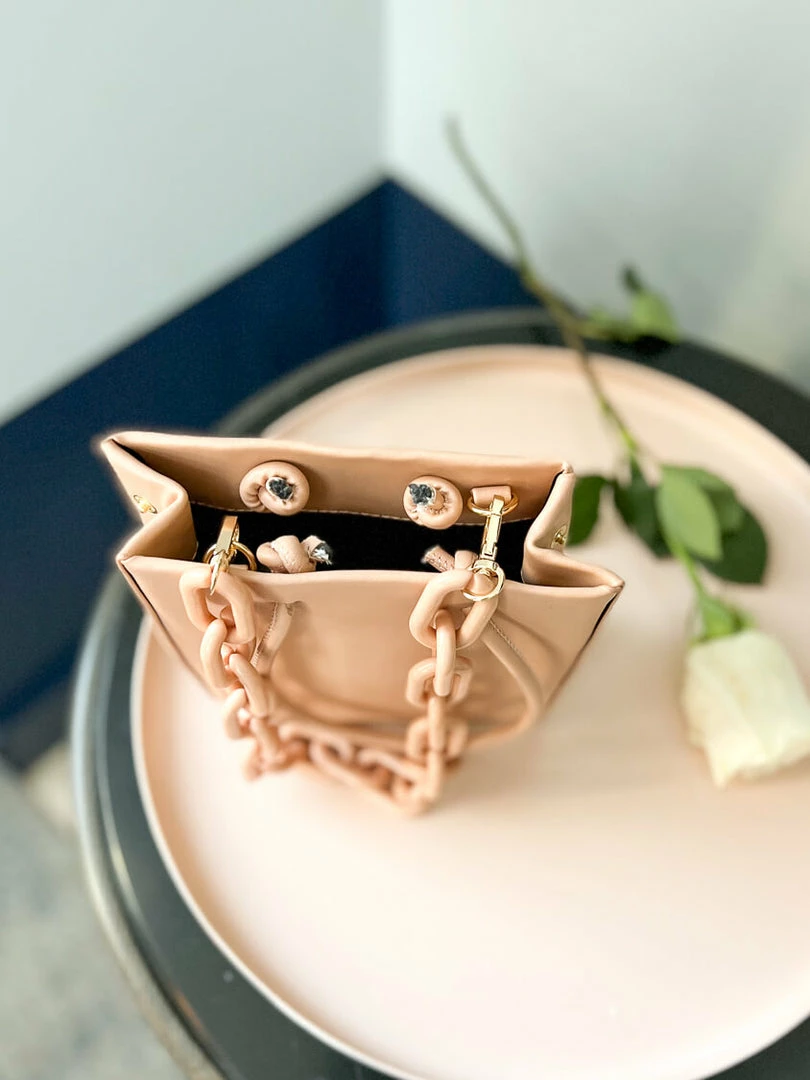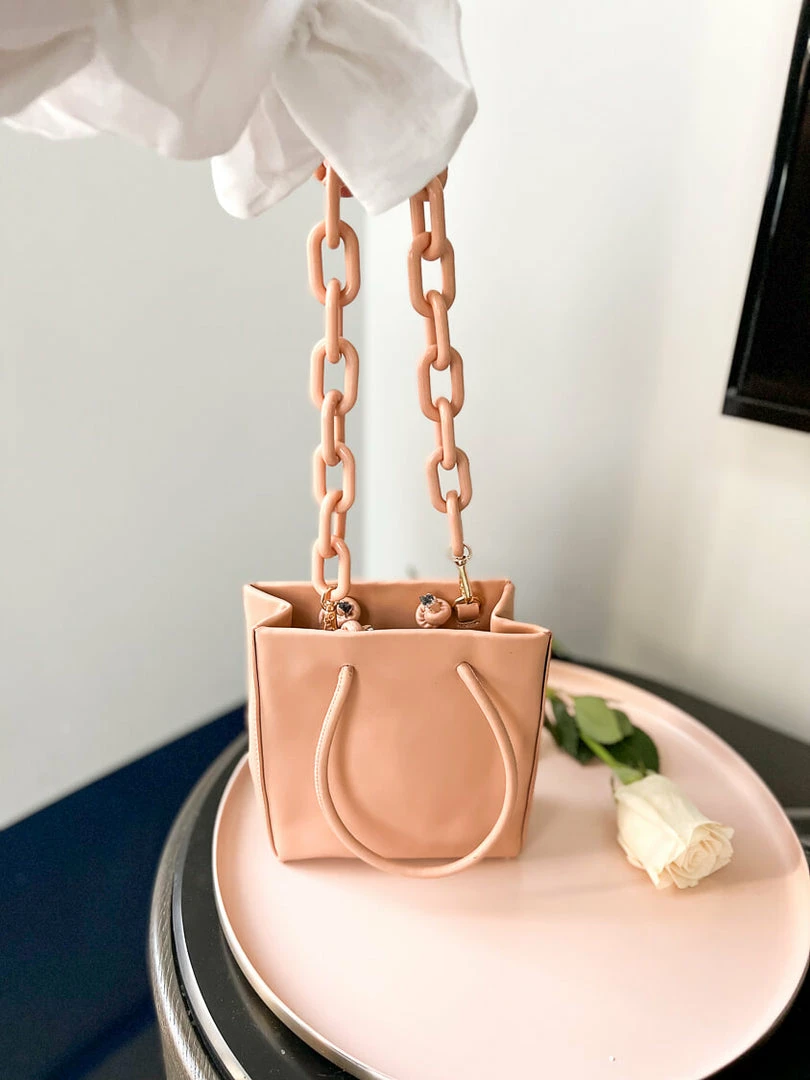 A compact and classic mini bag, the Chunky Chain Mini Tote Bag in nude features plenty of room for all of your essentials. Carry as a top handle mini bag or attach its edgy chunky chain shoulder strap to make this a statement making style. Pair with your favorite floral dress for that wow factor all year round. Includes two shoulder straps: chain and classic. Available in nude and white