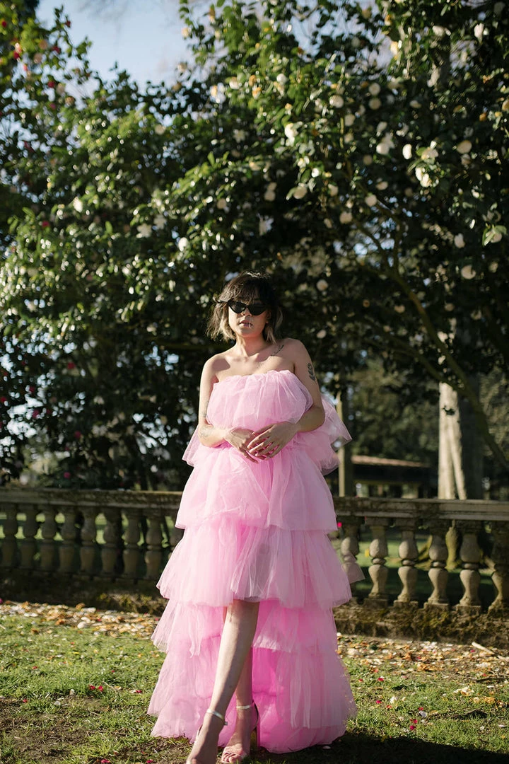 Our Chloe pink tulle maxi dress will bring a whimsical, bubbly effervescence to rehearsal dinners, engagement photos, bachelorette parties, and other special occasions. With a high-low style and a long tulle train, this dress is made for twirling and bringing a refreshing pop of color to any event. This eye-catching dress features a strapless top with an elastic band for your comfort. It’s lined with a stretchy mini dress lining to move alongside you.