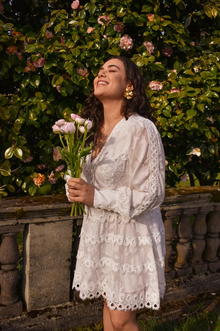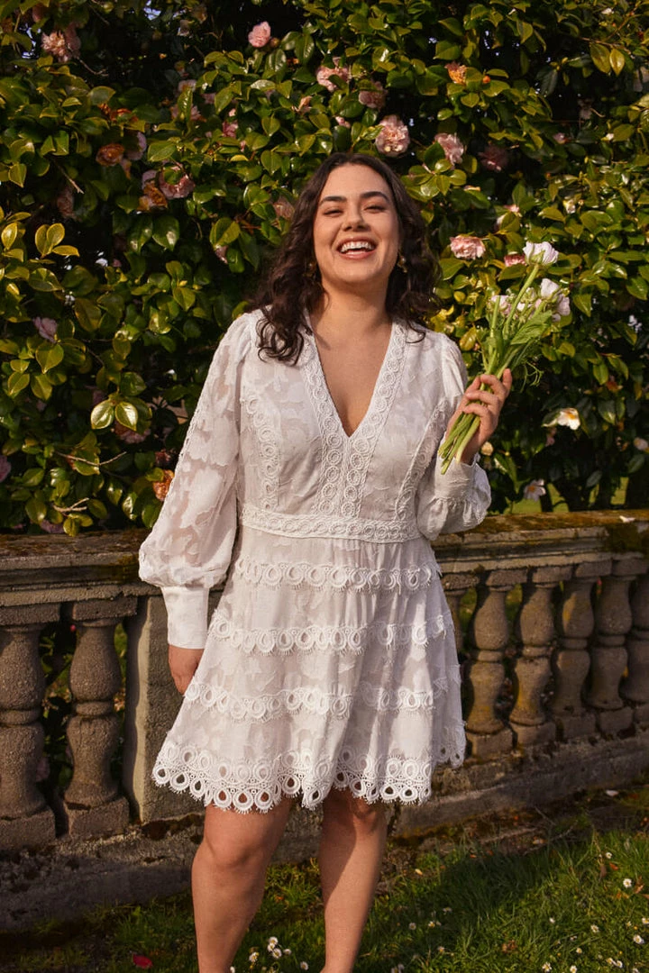 Floral print, romantic tiers and crochet detailing; dresses don’t get more special and unique than our Alexis Mini dress. Available in both regular and plus sizes, this mini features soft blouson sleeves, V-neckline and is adorned with romantic crochet and embroidered detailing throughout. Pair with our Serena Gold Floral studs for the perfect bridal shower look.