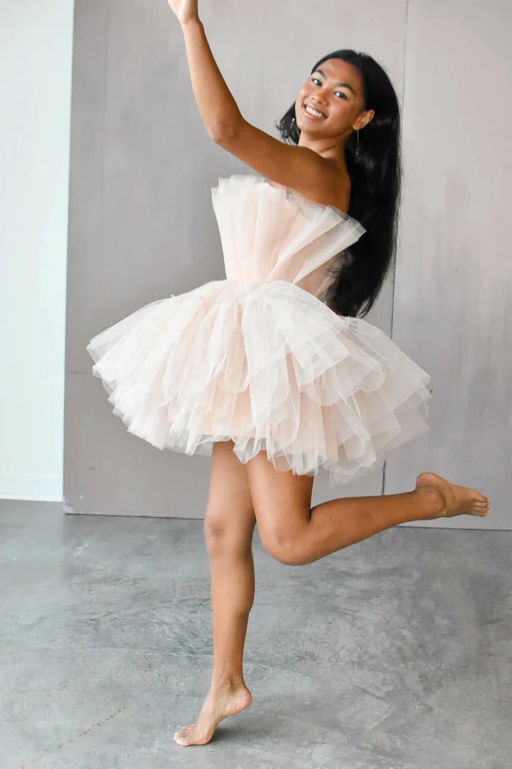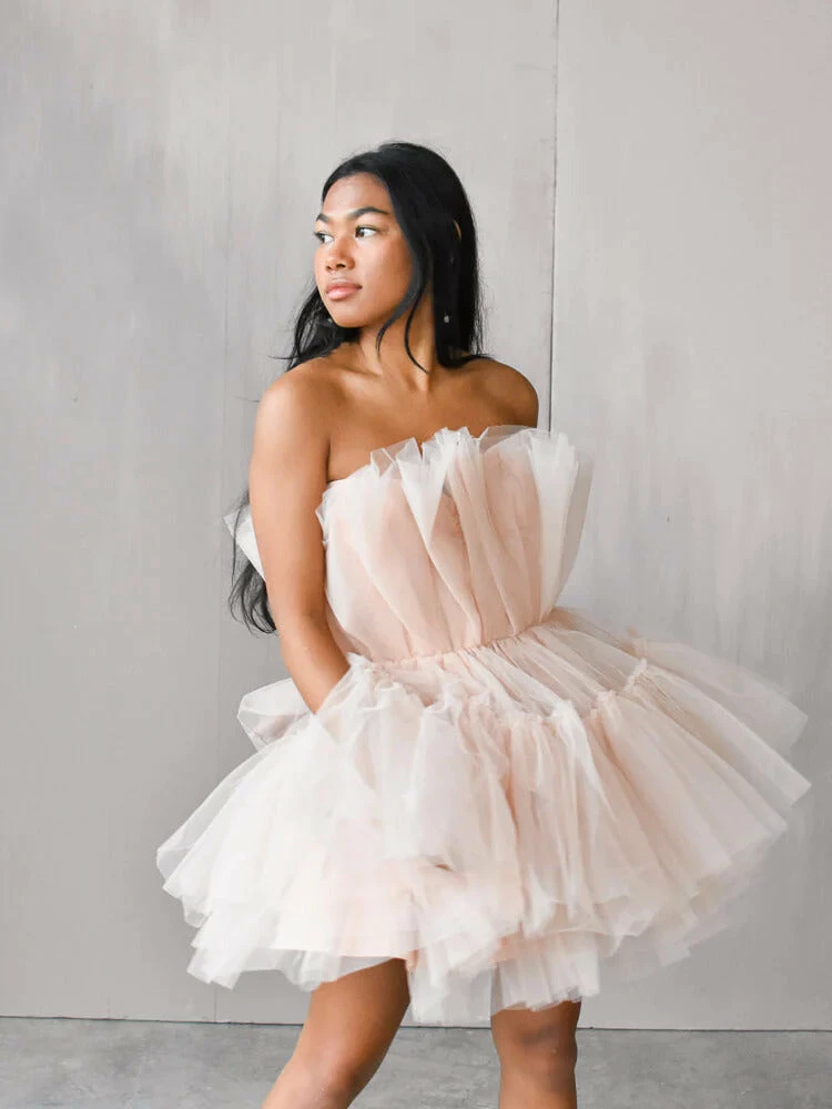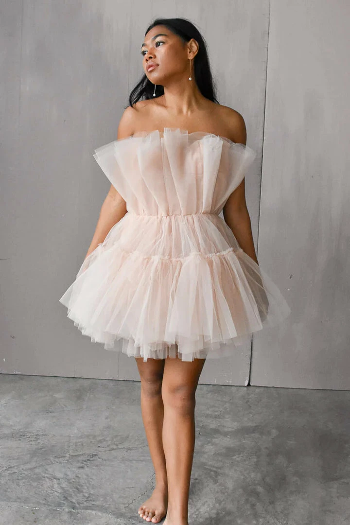 Crafted from layers of airy tulle, our Alizee nude tulle dress is perfect for bridal events or marquee birthday parties. A magical cocktail of ruffled tulle layers and a flattering-on trend fit, our tulle mini dress is also a stunning look for your next engagement photo session, bridal shower, or bachelorette party, too.