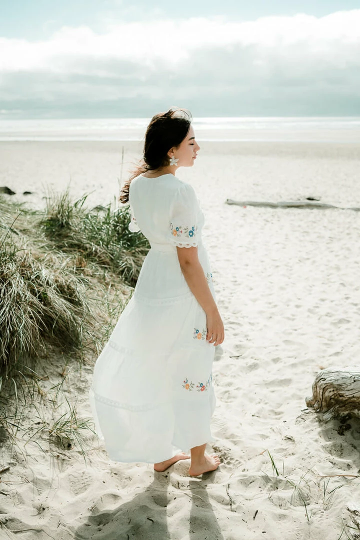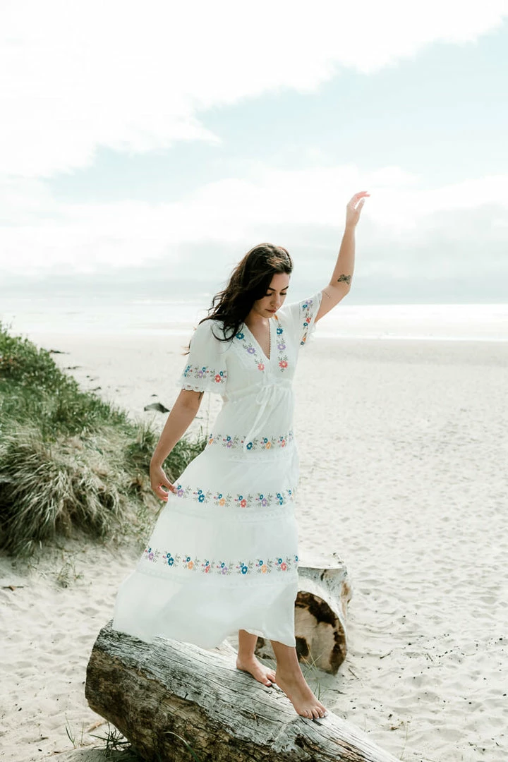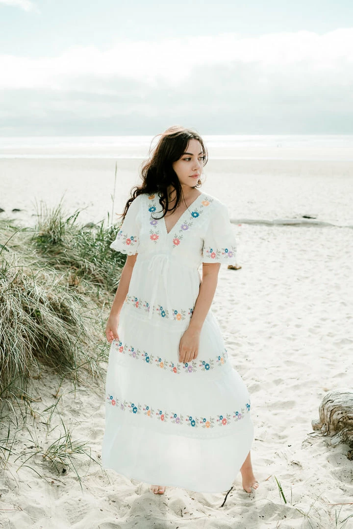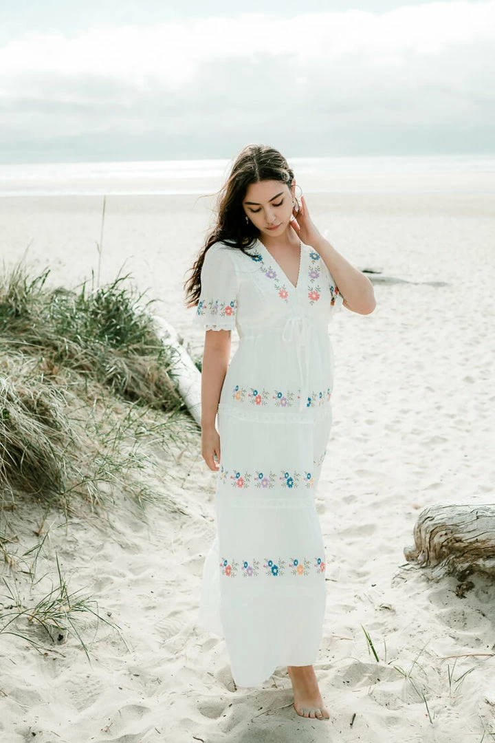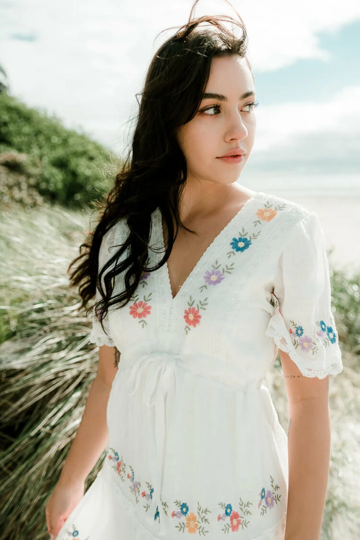 Take a summer stroll or prepare a picnic in our Aubrie dress. This maxi-length style features romantic floral embroidery as well as lace and crochet detailing on the bodice, sleeves and skirt. This is the perfect floaty summer dress. Pullover style with elastic waist. Tie-bow front helps fit to every body.