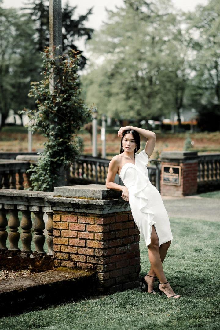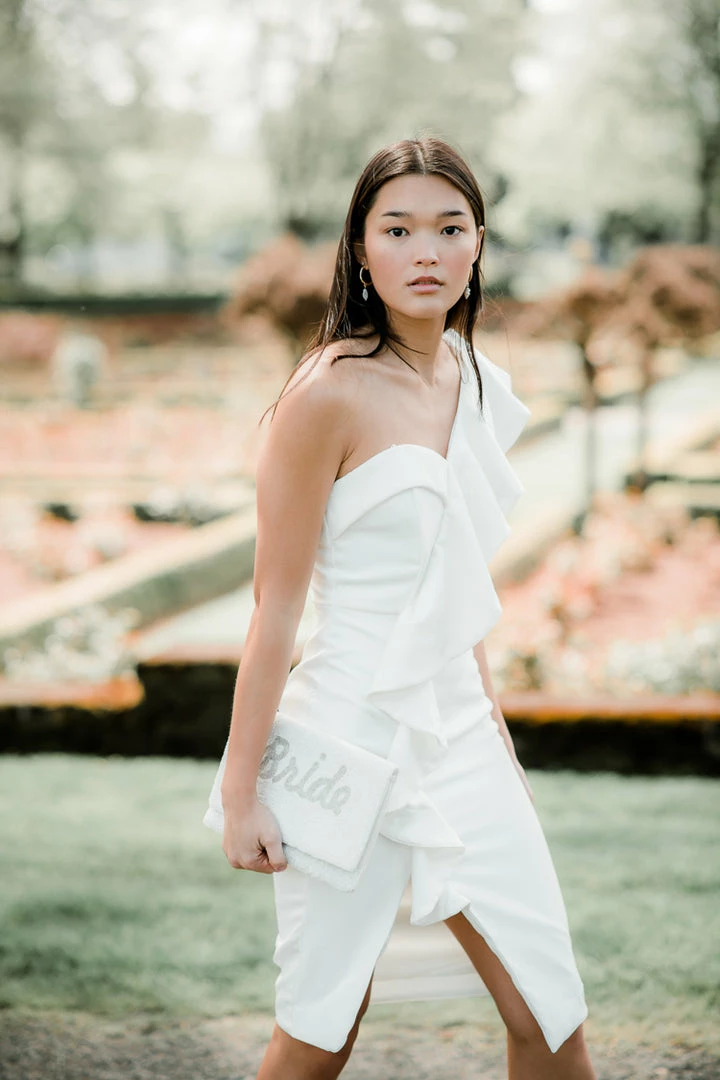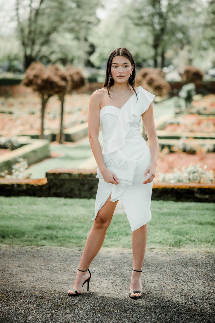 A perfect rehearsal dinner dress for the classic bride. The Bella dress is a classic midi style sheath dress, featuring a one-shoulder silhouette with a romantic ruffle detail. Front slit. Hidden back zipper. Pair with our Bride clutch.