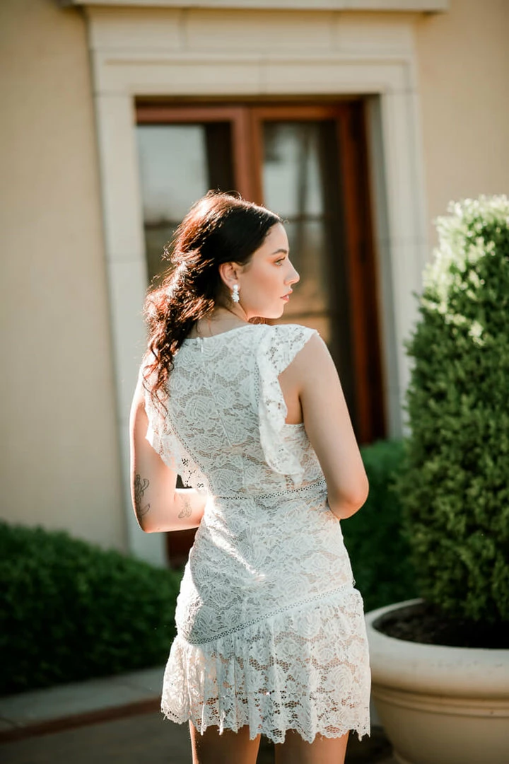 A short white lace dress is the perfect pick for a bride’s bachelorette party night out. Our Billie V-Neck Lace Mini Dress features all-over lace fabric, ruffle shoulders and v neckline. Hits upper mid thigh. We’re wearing with our Vivian Pearl drops.