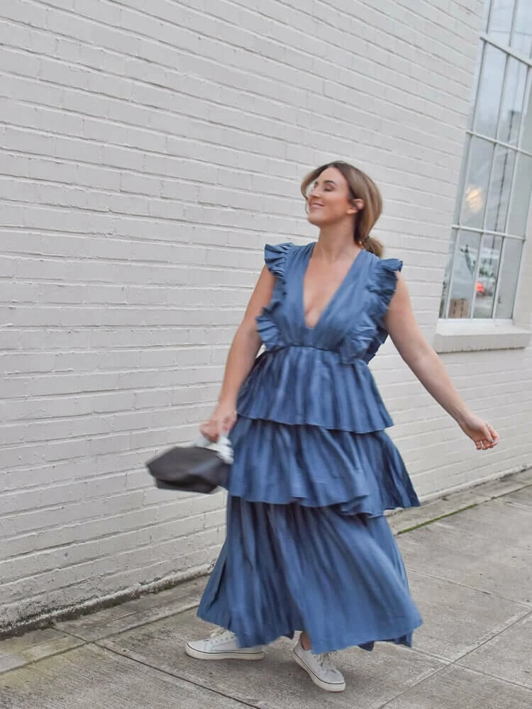 The captivating ruffle tiers of the Clara dress make it the perfect special occasion style. Cut from silky deep teal fabric, it features a flattering deep V neckline, elastic waistline and pleated ruffle tiered skirt. Ankle length. Tie back closure. Available in deep teal and blue gray.