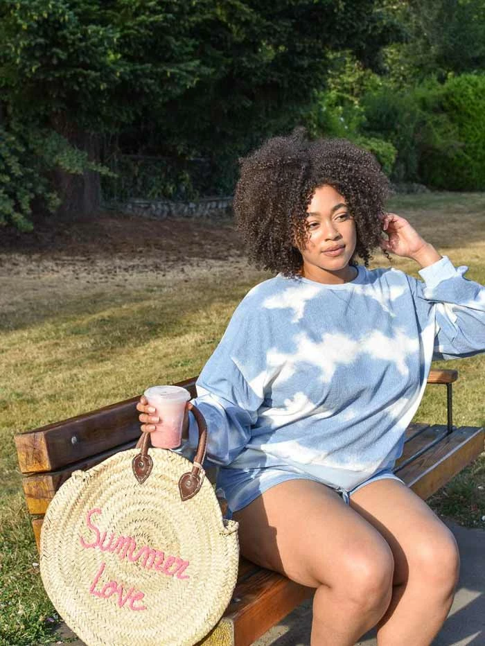 Nothing puts us on cloud nine these days than some loungewear. Start fall off right with this blue tie-dye loungewear set. Top features a long sleeves with banded hems. Shorts have elastic drawstring waistband. Available in regular and plus size.
