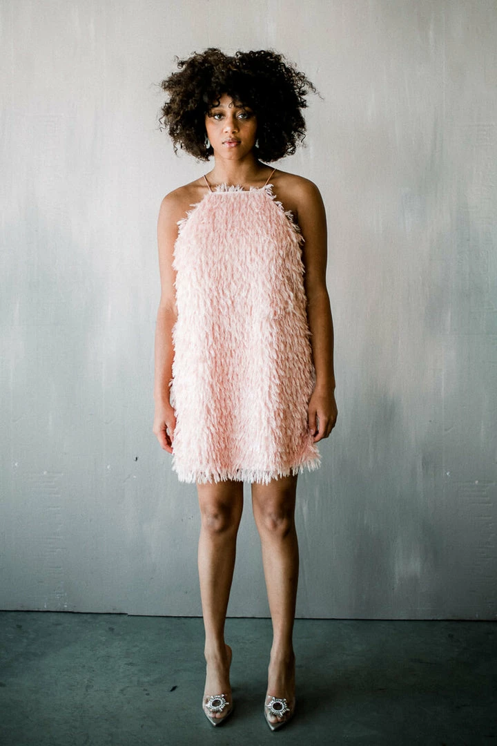 Flirty and fun, the Dawn dress is a mini style that is crafted from a soft 3D fringe textured fabric that is reminiscent of feathers. Cut in a high neck trapeze-style silhouette, this head-turner is available in both pale pink and blue. Pullover style.