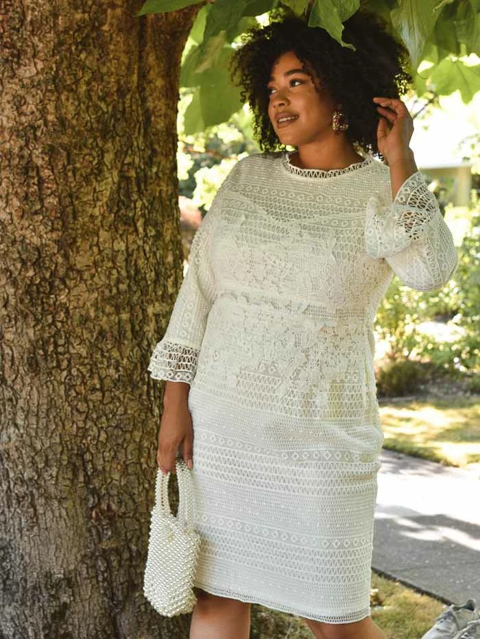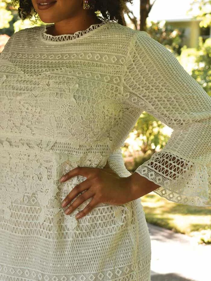 Looking for a plus size rehearsal dinner dress? Our Elizabeth White Long Sleeve Lace Dress is picture perfect for brides-to-be. This little plus size white dress features allover floral lace and crochet detailing, mini bell sleeves and a high neck. Hits just below the knee. Hidden zipper closure.
