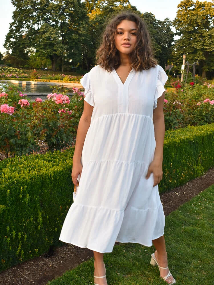 A plus size bridal event dress for any season, the Erika White Midi Dress features romantic flutter sleeves and a tiered skirt. Pull-over style. We love how swingy the body of this style is! We’re pairing with gold earrings and swept back hair.