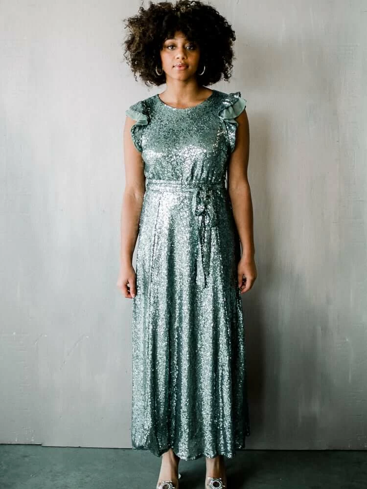 Glittering sequins and a glam silhouette make the Flutter Sleeve Sequin Maxi a showstopper. Available in both rose gold and deep green silver, this style is a modern take on the traditional holiday sequin dress with its full length skirt, flutter sleeves and optional belt. Hidden back zipper. Fully lined.
