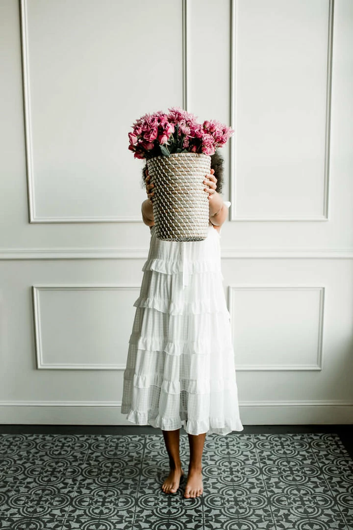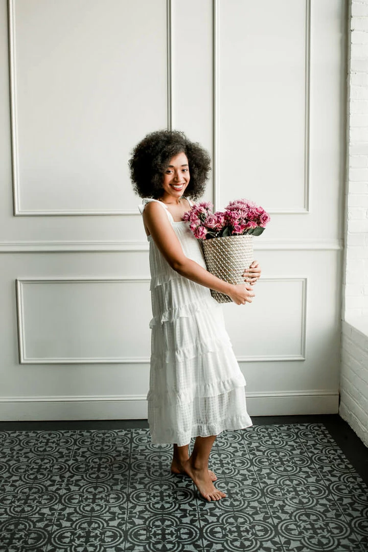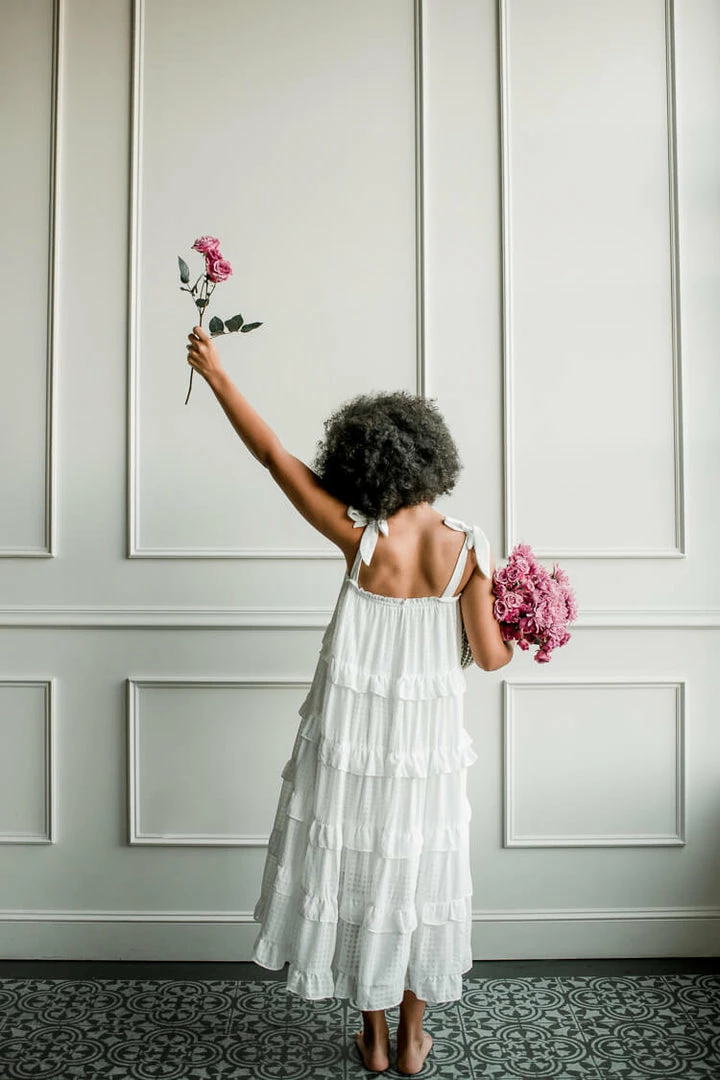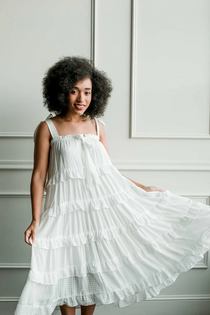 Meet Grace! This easy-to-wear white ruffle tier midi dress is one of our favorite styles. We love the femininity found in its layered frills, soft flowy fabric and bow tie shoulders. Light gingham print throughout. Hits low calf. This is the ideal choice for relaxed bridal and baby showers.