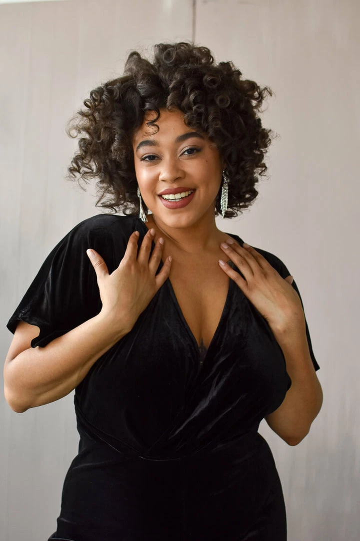 A classic black jumpsuit in sumptuous velvet makes for the perfect holiday office party look. Classic wide legged style. Deep v neckline. Zipper back. Add fancy statement earrings like the Kennedy Arch drops for a show-stopping look.