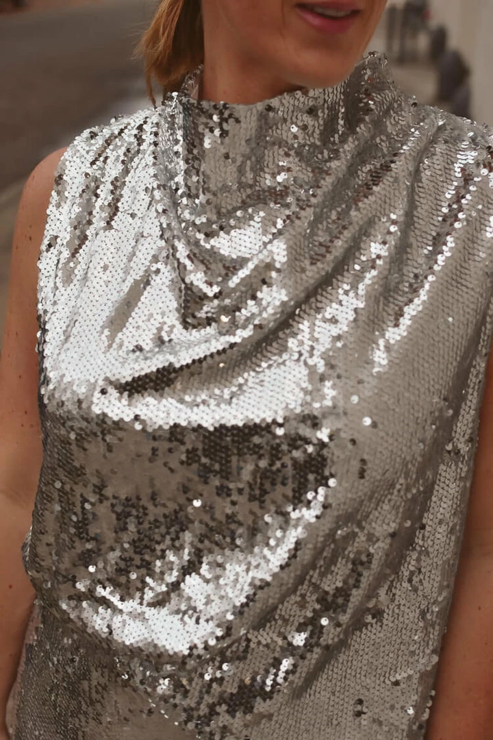 A little silver sequin party dress with a twist. The Party Favor dress features a draped mock neck and muscle style top. Hits mid-thigh. Zipper back. This flirty sequin mini brings you timeless style year after year.