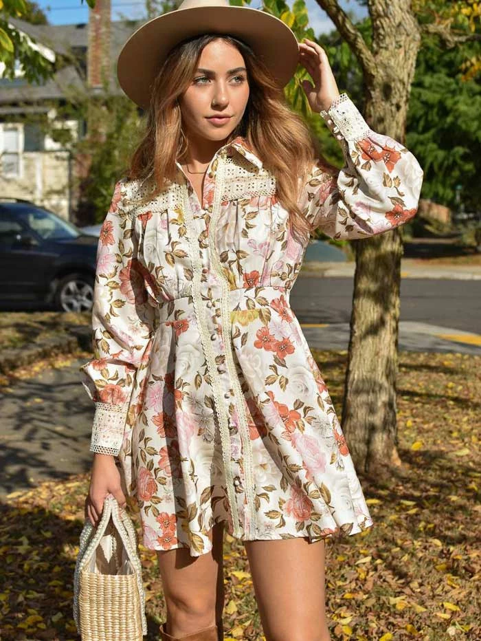 The classic shirtdress gets an ultra-feminine floral makeover with our Adelaide Floral Shirtdress. This mini dress is cut from mid-weight, non-stretch floral print fabric and is adorned with cream, crochet details on the cuffs, chest and button placket. This is one of our favorite floral dresses for women. Try it with tall brown boots and our Grace bag for brunch with friends.