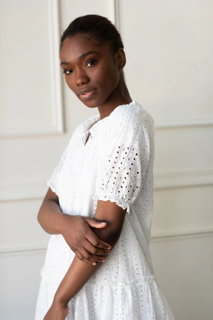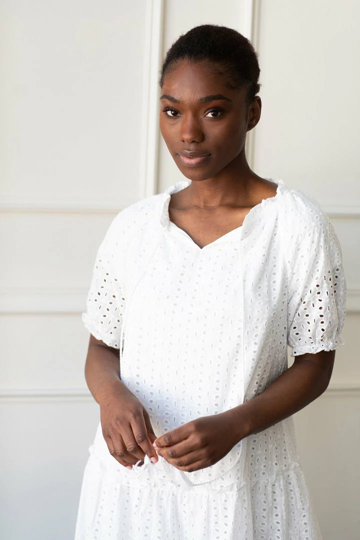 The Brook White Eyelet Midi dress is an effortlessly chic option. Features eyelet fabric, tiered bottom and tassel tie neck, this dress will take you from a walk through the park to dining al fresco with friends. This will also be one of your summer go-to brunch outfits.