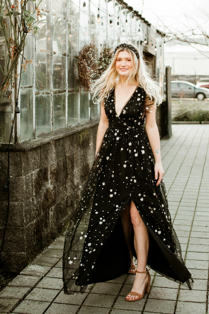 The Starry Eyed Sequin Star Mesh Maxi Dress is a Confête favorite. Starry Eyed features an a-lined silhouette, deep v-neck, glitter stars and a slight ruffle cap sleeve. Fully lined. Hidden back zipper enclosure. 100% poly. Hand wash cold. Comes in black and gold. Pictured in S and L.