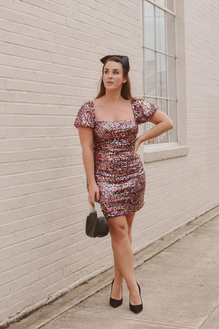Multi-colored sequins in a pink color palette bring unmistakable glamour to a classic mini dress. The Stella Pink Sequin Mini dress features a square neckline and puff sleeves. Hits upper mid-thigh.