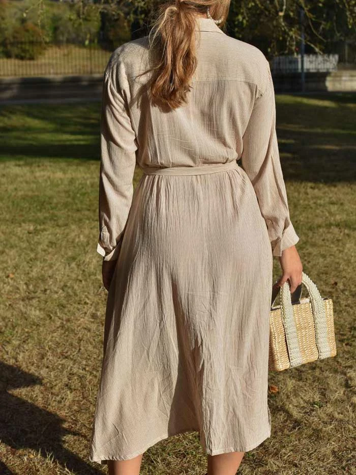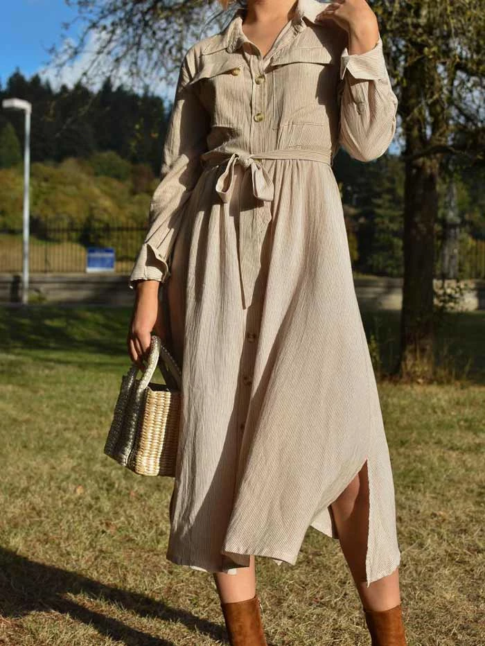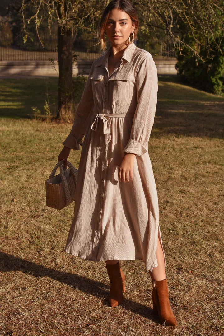 Our Tan Stripe Stacey Shirtdress is a wardrobe staple. This midi-length dress combines a classic shirtdress silhouette with vintage-inspired tan striped fabric. We are wearing it with tan booties and an ivory hat for a fall weekend adventure.