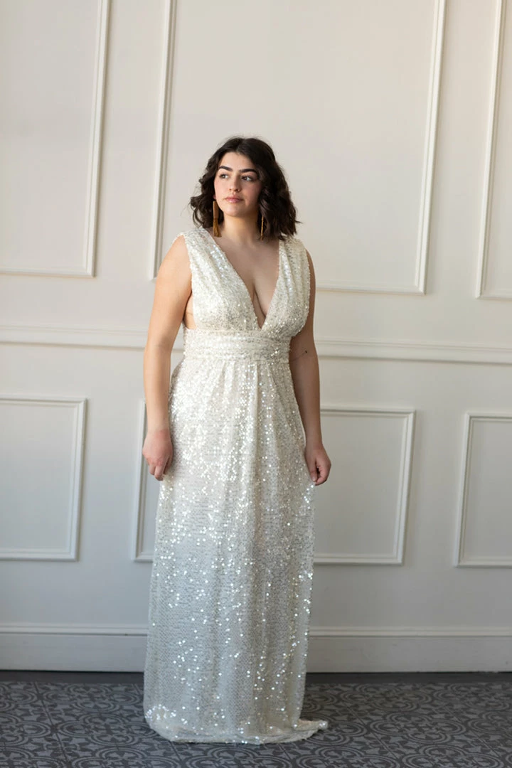 This deep v-neck, iridescent sequin column dress brings the bridal glamour to any wedding event. Makes a stunning after party or rehearsal dinner dress. Fully lined. Hidden back zipper enclosure. Flirty side-slit. Pictured in S and L.