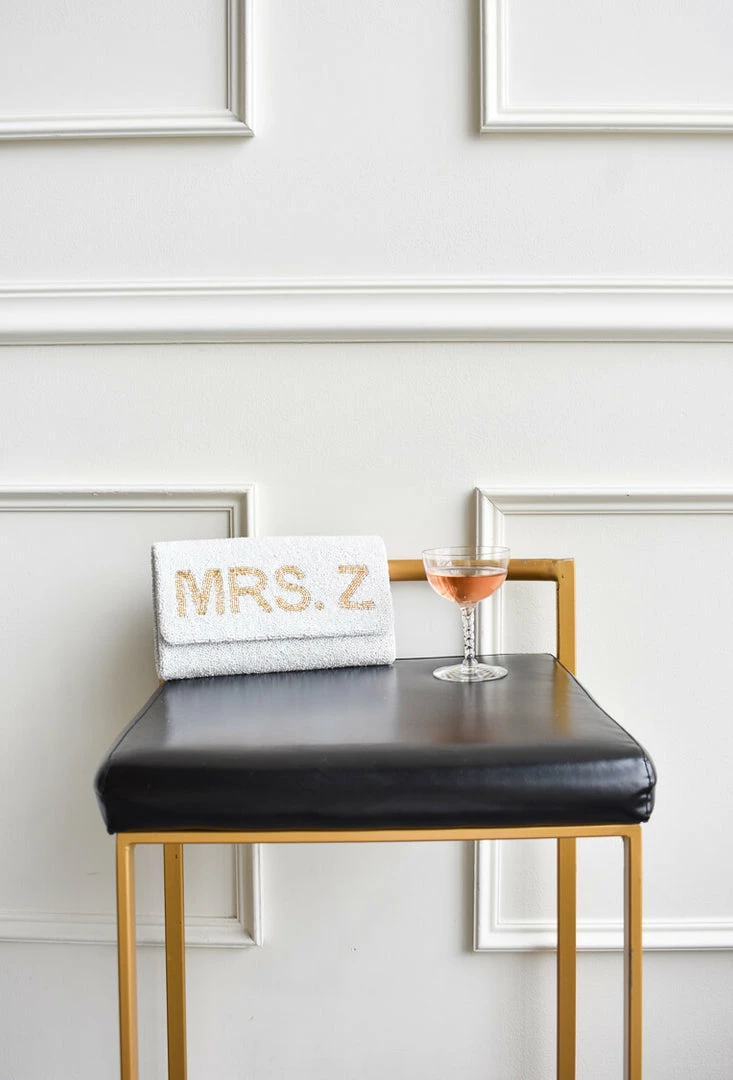 What better way to celebrate your big day than with a customizable bridal initial clutch. Confête has teamed up with Tiana NYC to create your one-of-a-kind bridal clutch, featuring all-over seed white and bronze beading. Pair your customized initial with a Mrs. on this envelope-style clutch. This also makes a great gift for brides in your life.