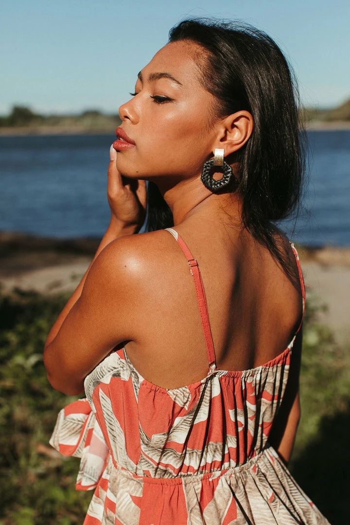 A statement-making earring with a resort vibe, the Hana Black Rattan Studs are a fun way to dress up any outfit. Crafted from black rattan in a hexagonal shape. Post closure. We’re wearing with loose waves and our Bryce maxi dress to outdoor weddings this season.