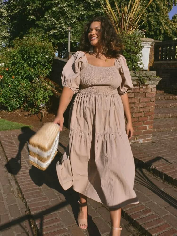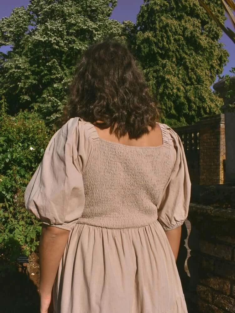 Confête Heath Puff Sleeve Midi Dress – Taupe Clothing