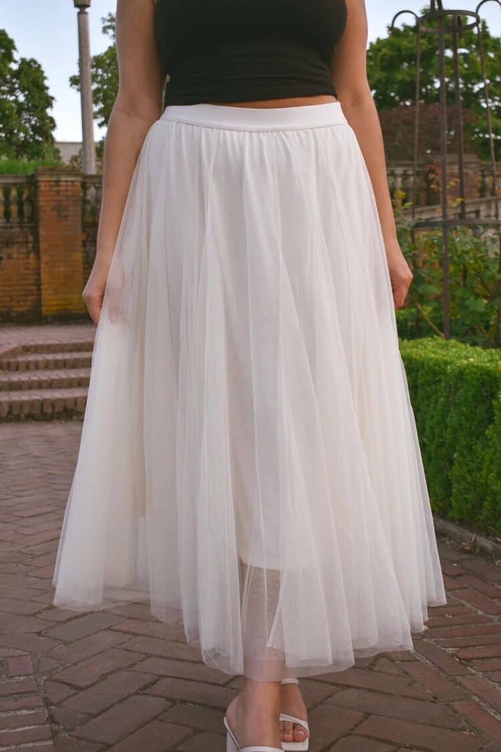 A sweeping skirt thats bound to turn heads. Our Ivory Tulle Skirt is a midi-length plus size skirt that features soft ivory tulle layers and an elastic waistband for a comfortable fit. We’re pairing this with a cream or black sweater for a classic engagement photo look.