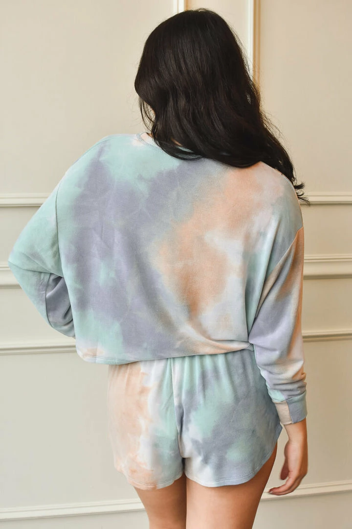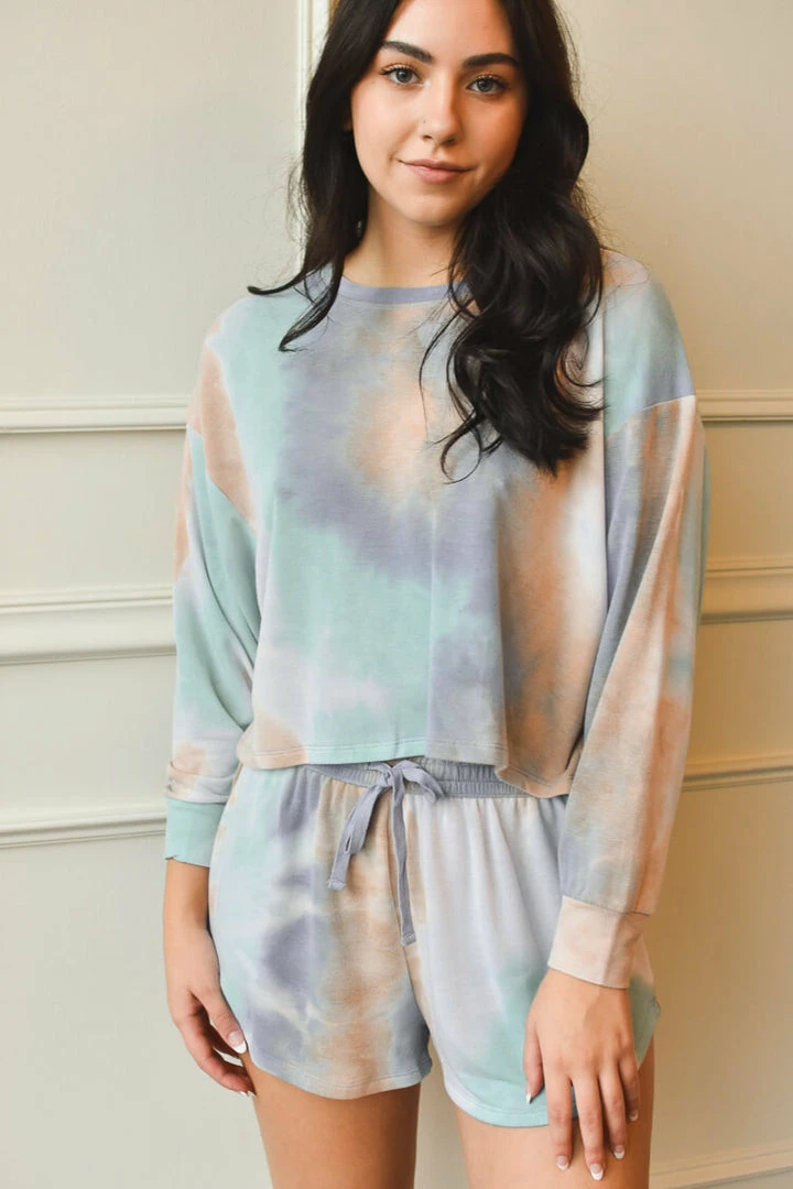 Everyone is looking for loungewear in 2021 that is anything but basic. So go ahead and toss those old sweats aside and try on our La Jolla tie dye loungewear. This ocean blue-inspired set comes in super soft, lightweight fabric. Cut in a breezy, relaxed shape. Slight cropped crewneck top. Drawstring shorts with pockets.