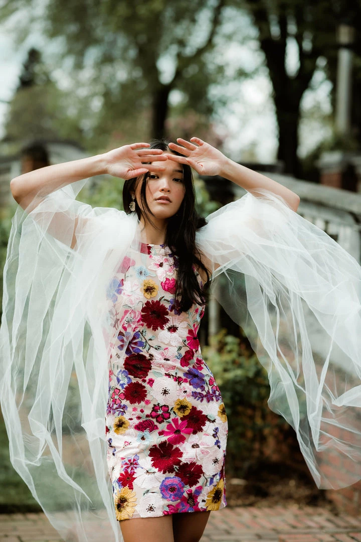 This is the dress for trend-forward 2022 brides! The Lyla mini dress is a classic sheath style silhouette that features gorgeous, colorful, embroidered all-over flowers. Hidden zipper back. We’re wearing to our bridal shower with minimalist accessory like the Samira drops.