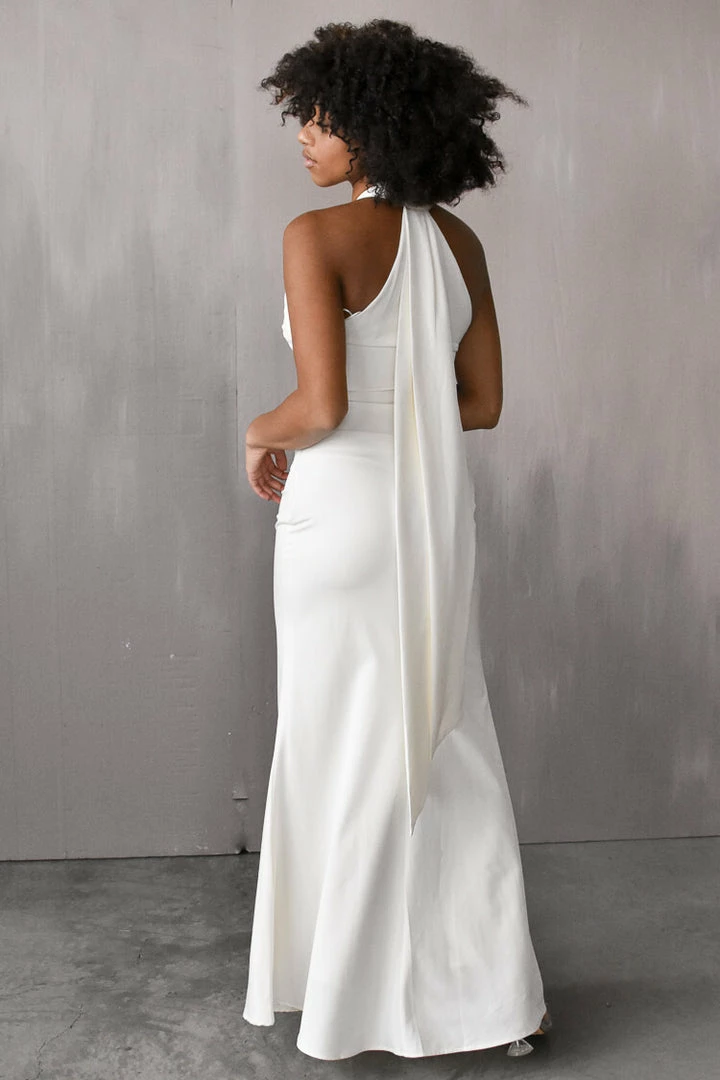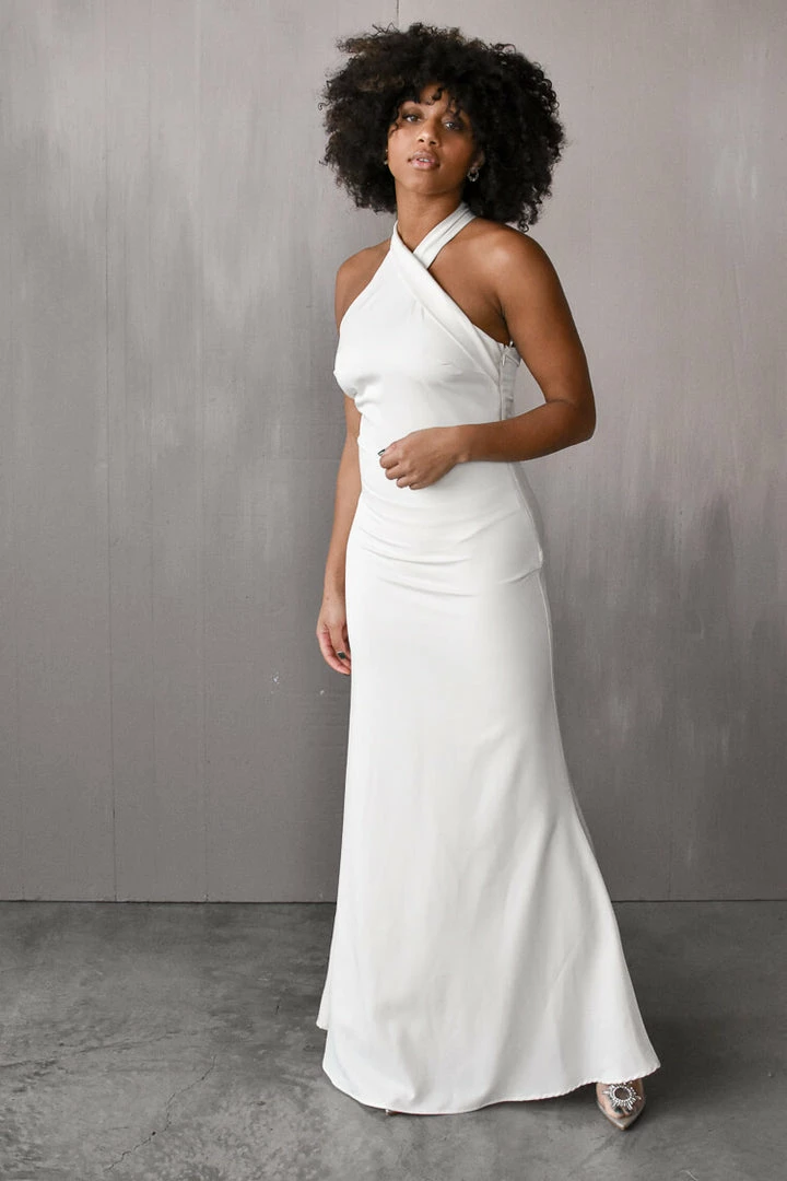 A dream engagement photo dress for those brides looking for a more dramatic and formal look. The Margot Satin Maxi is an ivory halter-style, body-skimming maxi dress. Leave guests looking as you walk away with its chic train.