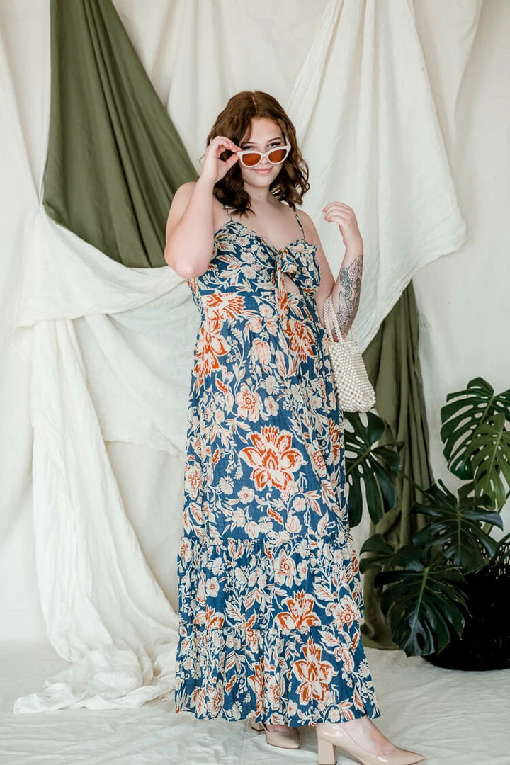 Our pick for your next wedding guest invite – meet Mari. This floor-sweeping floral gown is cut from a luxe teal and brown botanical print fabric. Featuring adjustable shoulder straps, a tie-front bralette top and flirty cutout.
