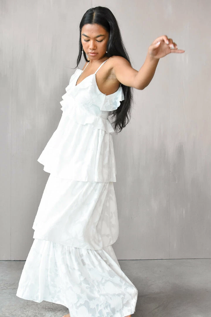 Our newest arrival for the beachy bride. The Marie Maxi dress is a floaty, white maxi dress, adorned with romantic tiers and ruffles. Crafted from a white burnout-style floral print fabric, we love this style for a rehearsal dinner on the beach or outdoor engagement photos. Pair with our Aphrodite Pearl drops.