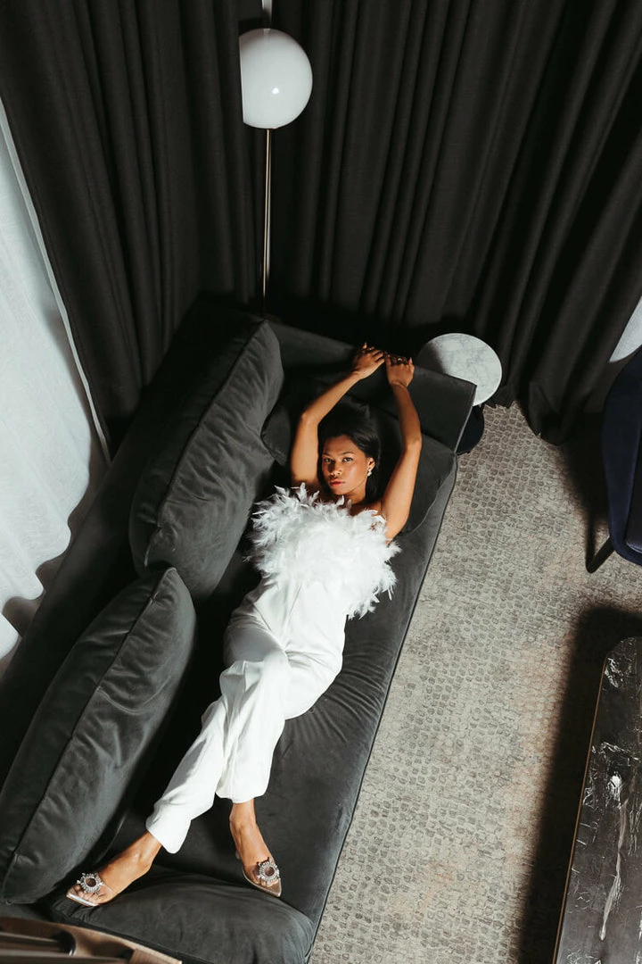 Statement-making feather trim is what makes the Maxwell wide-legged jumpsuit a showstopper. Strapless style. Fitted bodice with hidden zipper back. Floaty wide leg pants elongate your silhouette. This jumpsuit hugs your curves while keeping your comfortable. Our pick for trendsetting brides’ rehearsal dinner look.