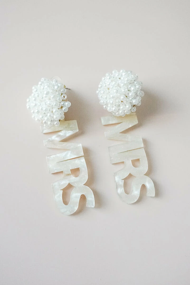 A must have for brides to be for their bridal brunch! These Mrs. dangle earrings feature an acrylic spelled out Mrs. and a decorative pearl cluster. Stud back.