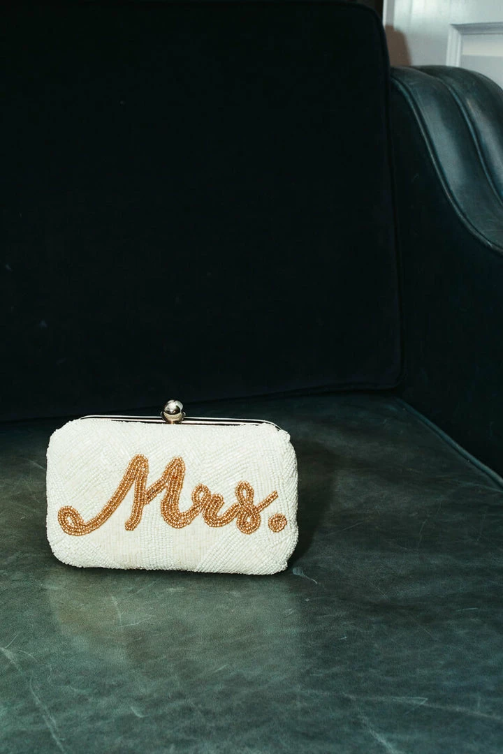 The perfect addition to any bridal wardrobe. Our Mrs. Minaudière features a hard frame shell and beaded front. This style comes with an optional shoulder chain. Cloth backing.